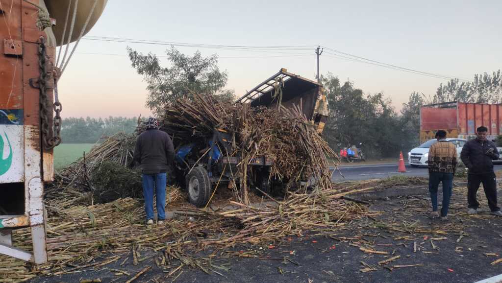 किच्छा: भूसी से भरा ओवरलोड ट्रक की टक्कर से पलटी गन्ने से भरी 2 ट्रॉली, ट्रैक्टर के हुए दो हिस्से