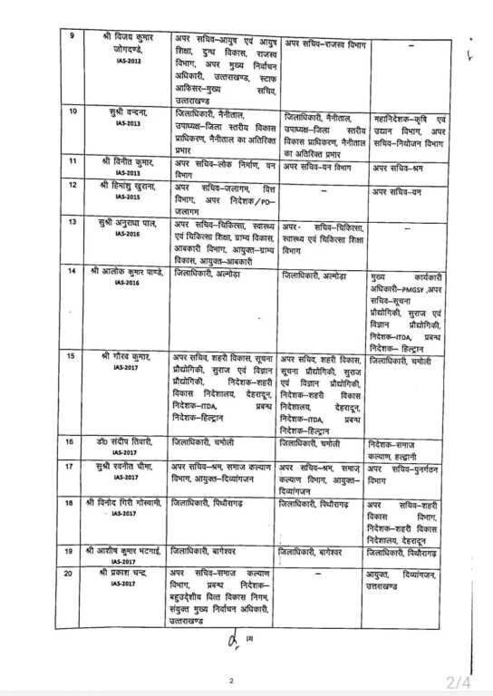 उत्तराखण्ड शासन ने आईएएस पीसीएस अधिकारियों के बंपर तबादले कर दिए हैं। शासन द्वारा जारी आदेश में 23 आईएएस, 18 पीसीएस एवं 3 सचिवालय सेवा के अधिकारियों अर्थात कुल 44 अधिकारियों के दायित्वों में फेरबदल किया गया है। इतना ही शासन द्वारा 5 जिलों के जिलाधिकारियों को बदल दिया गया है। जिनमें बागेश्वर, अल्मोड़ा, पिथौरागढ़, चमोली शामिल हैं।