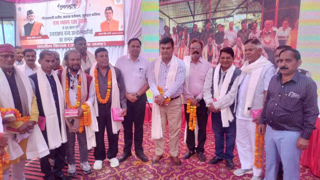 किच्छा- राज्य स्थापना रजत जयंती दिवस के अवसर पर राज्य आन्दोलनकारियों को सम्मानित किया गया।, अपर जिलाधिकारी कौस्तुभ मिश्रा किच्छा एसडीएम गौरव पांडेय तहसीलदार गिरीश चंद्र त्रिपाठी सहित राज्य आन्दोलनकारियों व अन्य अधिकारियों द्वारा राज्य आन्दोलन में अपना सर्वस्व न्यौछावर करने वाले शहीदों के चित्रों पर माल्यार्पण एवं पुष्प अर्पित कर श्रद्धांजली दी गयी, तथा राज्य आन्दोलनकारियों को पुष्पमाला व अंगवस्त्र भेटकर सम्मानित किया गया व कार्यक्रम का दीप प्रज्वलित कर शुभारम्भ किया।